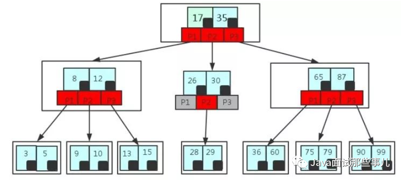 这里只是一个简单的B树,在实际中B树节点中关键字很多的,上面的图中比如35节点,35代表一个key(索引),而小黑块代表的是这个key所指向的内容在内存中实际的存储位置,是一个指针。