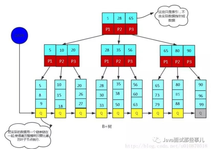 非叶子节点(比如5,28,65)只是一个key(索引),实际的数据存在叶子节点上(5,8,9)才是真正的数据或指向真实数据的指针。