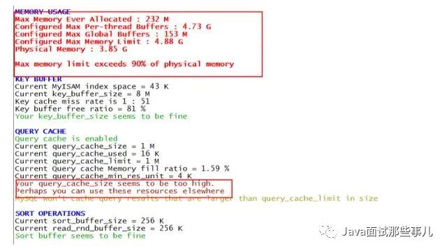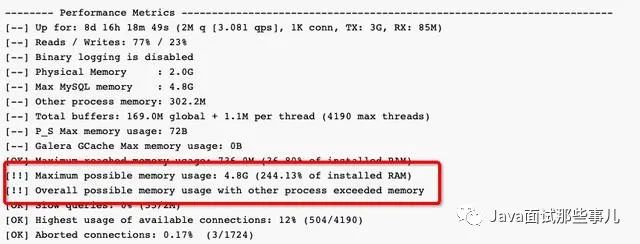 1)重要关注 [!!](中括号有叹号的项)例如 [!!] Maximum possible memory usage: 4.8G (244.13% of installed RAM),表示内存已经严重用超了。