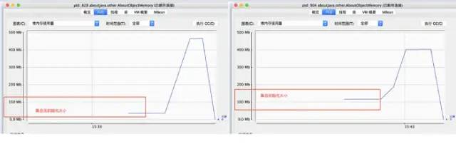 这里我贴一张,集合未初始化大小和初始化大小内存占用对比图,大家可以看到是有内存上的差异,在ArrayList数组中用于存放数据的是transient Object[] elementData;Object数组,所以它里面存放的是指向对象的指针,一个指针占用4个字节,所以就有两千万个指针,那么就是76M。我们可以看到差异图和我们预想的一样。