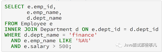 select e.emp_id, e.emp_name, d.dept_name from Employee e inner join Department d on e.dept_id = d.dept_id where d.dept_name = 'finance' -- and e.emp_name like '%A%'; add e.salary > 5000