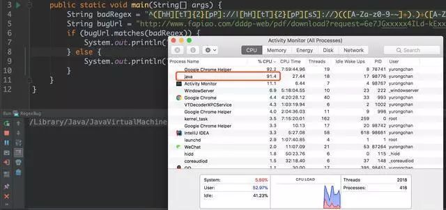 其实这里导致 CPU 使用率高的关键原因就是:Java 正则表达式使用的引擎实现是 NFA 自动机,这种正则表达式引擎在进行字符匹配时会发生回溯(backtracking)。而一旦发生回溯,那其消耗的时间就会变得很长,有可能是几分钟,也有可能是几个小时,时间长短取决于回溯的次数和复杂度。