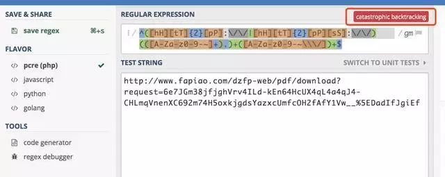 例如我本文中存在问题的那个 URL 使用该网站检查后会提示:catastrophic backgracking(灾难性回溯)。