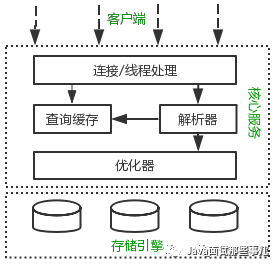 最下层为存储引擎,其负责MySQL中的数据存储和提取。和Linux下的文件系统类似,每种存储引擎都有其优势和劣势。中间的服务层通过API与存储引擎通信,这些API接口屏蔽了不同存储引擎间的差异。