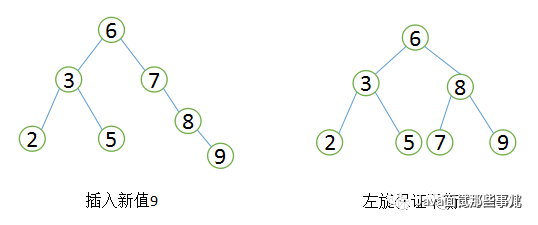平衡二叉树首先需要符合二叉查找树的定义,其次必须满足任何节点的两个子树的高度差不能大于1。显然图②不满足平衡二叉树的定义,而图①是一课平衡二叉树。平衡二叉树的查找性能是比较高的(性能最好的是最优二叉树),查询性能越好,维护的成本就越大。比如图①的平衡二叉树,当用户需要插入一个新的值9的节点时,就需要做出如下变动。