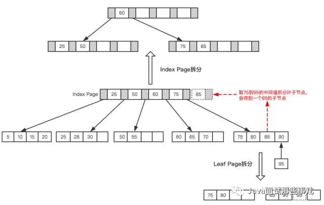 最后插入一个节点95,这时候Index Page和Leaf Page都满了,就需要做两次拆分,如下图所示。