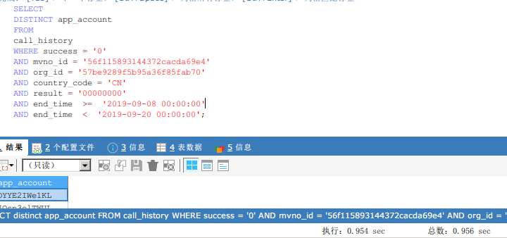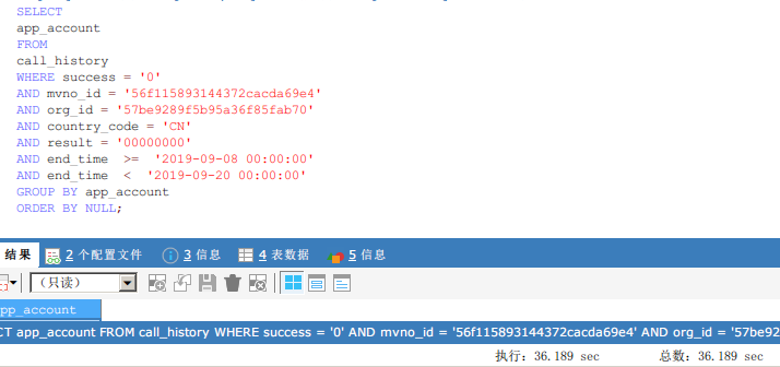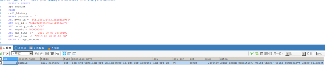 既然group by慢,换distinct试试??(这里就是本篇博客里说的神奇的地方了)虽然知道group by和distinct有很小的性能差距,但是真没想到,差距居然这么大!!!大发现啊!!我是真的希望就这么结束了,那这个问题就很简单的解决了,顺便还自以为是的发现了一个新知识。这个bug转给测试后,测试一测,居然还是30多秒!?这是什么情况!!???我当然是不信了,去测试电脑上执行sql,还真是30多秒。。。我又回我的电脑上,连接同一个数据库,一执行sql,0.8秒!?什么情况,同一个库,同一个sql,怎么在两台电脑执行的差距这么大!哎,现在发现了,只有用sqlyog执行这个“优化后”的sql会是0.8秒,在navcat和服务器上直接执行,都是30多秒。那就是sqlyog的问题了,现在也不清楚sqlyog是不是做什么优化了,这个慢查询的问题还在解决中(我觉得问题可能是出在mysql自身的参数上吧)。这里只是记录下这个坑,sqlyog执行sql速度,和服务器执行sql速度,在有的sql中差异巨大,并不可靠。1.所谓的sqlyog查询快,命令行查询慢的现象,已经找到原因了。是因为sqlyog会在查询语句后默认加上limit 1000,所以导致很快。这个问题不再纠结。③调整where条件里字段的查询顺序,有索引的放前面。⑤用子查询的方式,先查where条件里的内容,再去重。测试环境和现网环境数据还是有点不一样的,我贴一张现网执行sql的图(1分钟。。。):