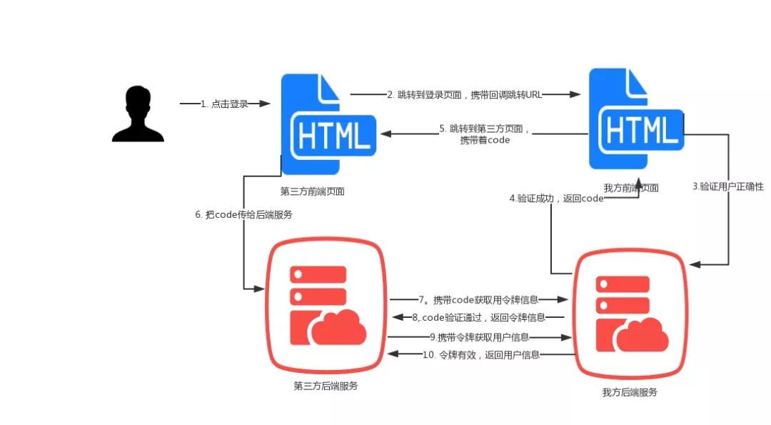 这里我要顺便说一下,令牌的下发是通过前端(浏览器)的跳转传输给第三方系统,然后第三方系统的前端传输给后端,然后第三方的后端携带令牌获取用户信息。