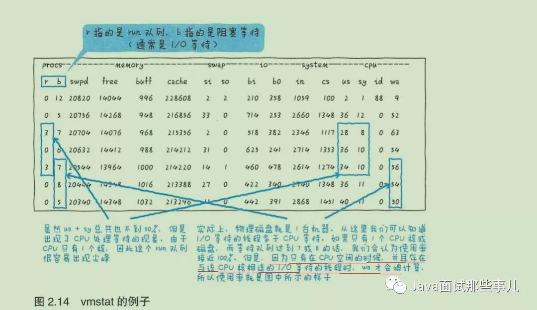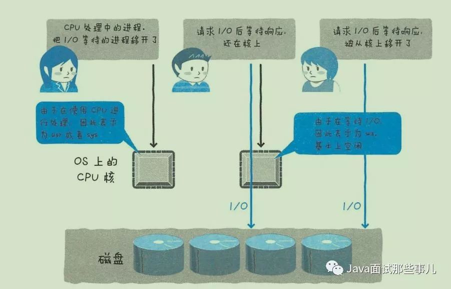 如vmstat中的wa 很高。但IO等待增加,wa也不一定会上升(请求I/O后等待响应,但进程从核上移开了)