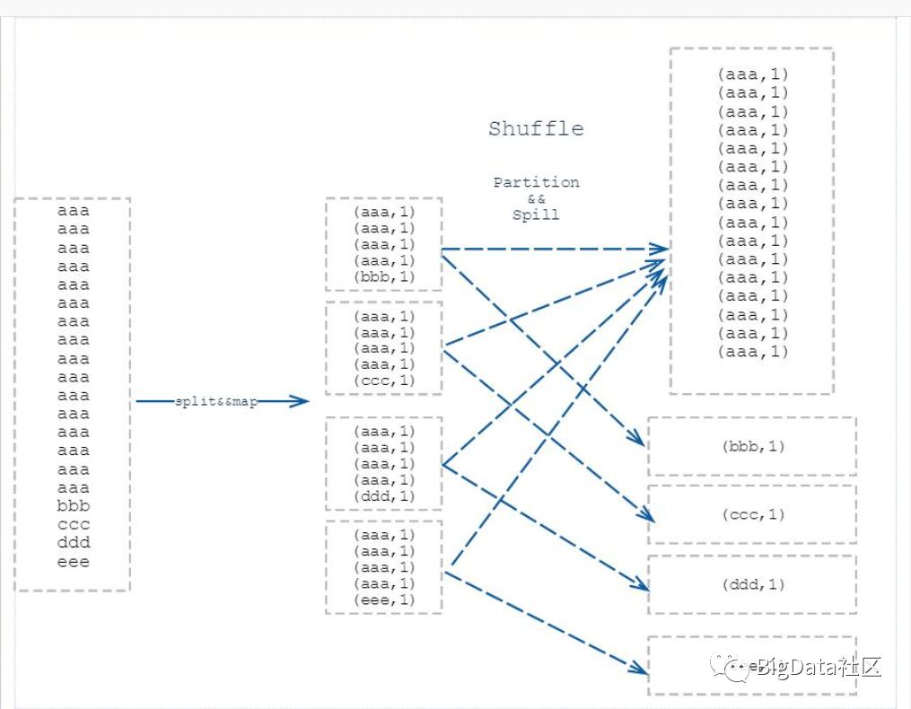 这样就能清楚看到,数据经过 map后,由于不同key 的数据量分布不均,在shuffle 阶段中通过 partition 将相同的 key 的数据打上发往同一个 reducer的标记,然后开始 spill(溢写)写入磁盘,最后merge成最终map阶段输出文件。