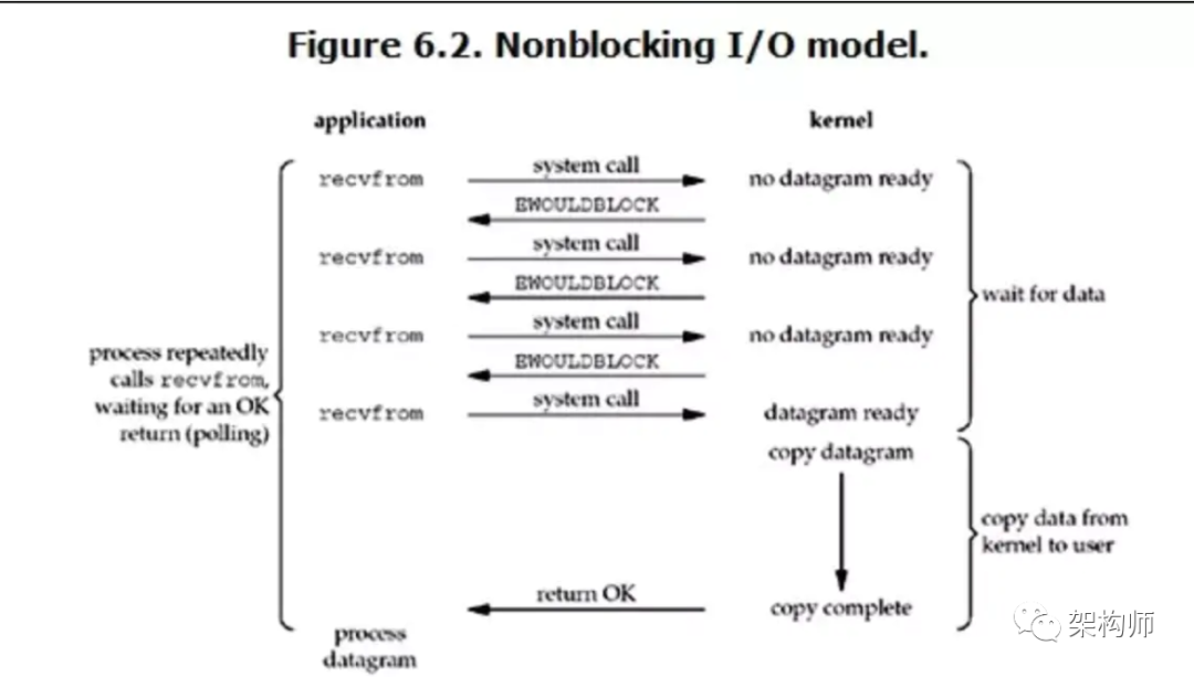 Socket socket = serverSocket.accept();// 不断轮询内核,哪个 socket 的数据是否准备好了while (true) {data = socket.read();if (data != BWOULDBLOCK) {// 表示获取数据成功doSomething();}}