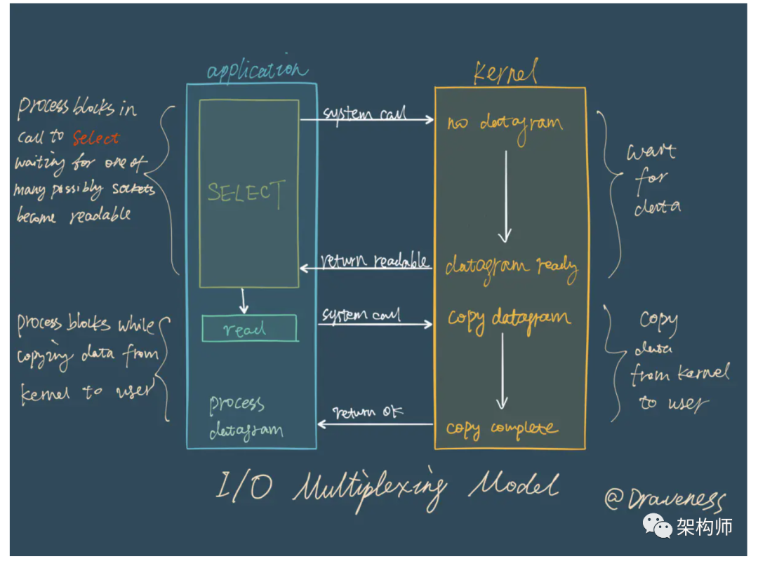 在 I/O 多路复用模型中,最重要的函数调用就是 select,该方法的能够同时监控多个文件描述符的可读可写情况,当其中的某些文件描述符可读或者可写时,select 方法就会返回可读以及可写的文件描述符个数。