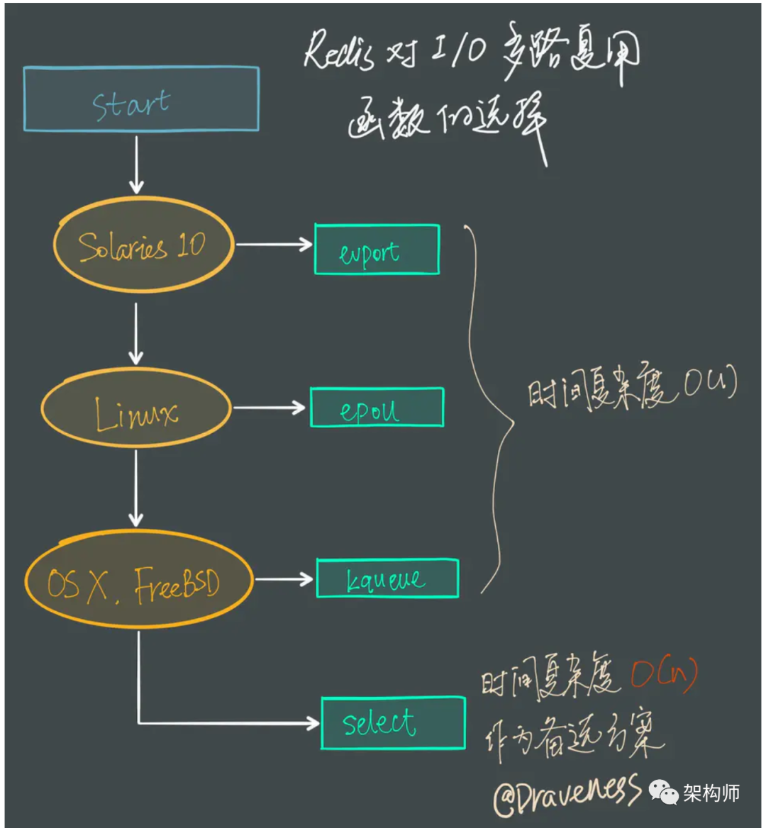 Redis 会优先选择时间复杂度为 $O(1)$ 的 I/O 多路复用函数作为底层实现,包括 Solaries 10 中的 evport、Linux 中的 epoll 和 macOS/FreeBSD 中的 kqueue,上述的这些函数都使用了内核内部的结构,并且能够服务几十万的文件描述符。