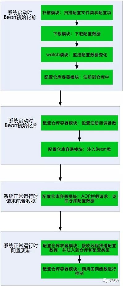 ReloadablePropertiesFactoryBean继承了Spring Properties文件的PropertiesFactoryBean类,管理所有当配置更新时要进行reload的配置文件。对于被管理的每一个配置文件,都会通过 配置仓库容器模块、扫描模块、下载模块、watch模块 进行配置获取至配置仓库里。