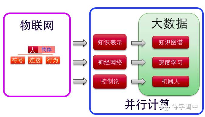 这张图,描述了人工智能的一个框架结构,建立在物联网,大数据和并行计算基础之上的人工智能。换个表达方式,正是有了物联网的感知和控制,大数据和算法,海量的分布式计算资源,使得大规模的人工智能成为可能,最终成就了人工智能。