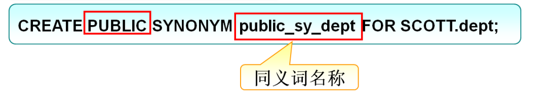 CREATE [OR REPLACE] PUBLIC SYNONYM [schema.]synonym_name FOR [schema.]object_name ;