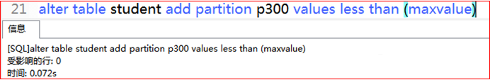 (5)按范围分区是,如果某些记录暂时无法预测范围,可以创建maxvalue分区,所有不在指定范围内的记录都会被存储到maxvalue所在的分区中