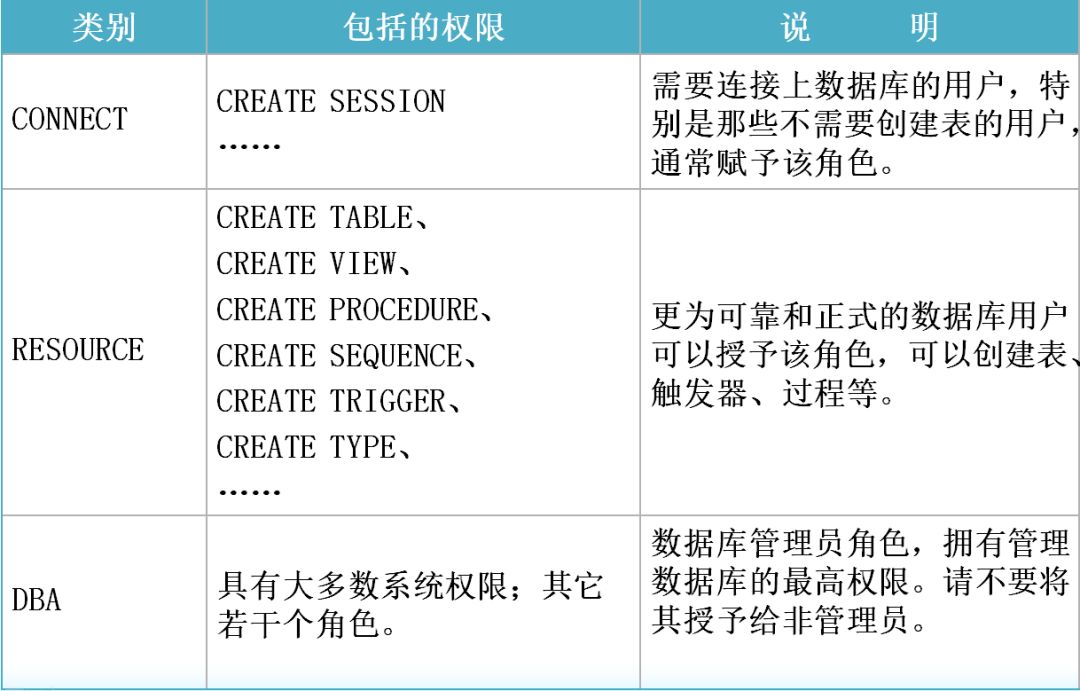 (2)RESOURCE:拥有创建表、触发器、过程等权限