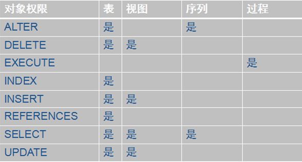 对象权限是指针对某个特定模式对象执行操作的权利,只能针对模式对象来设置管理对象权限,包括:表、视图、序列、存储过程等。