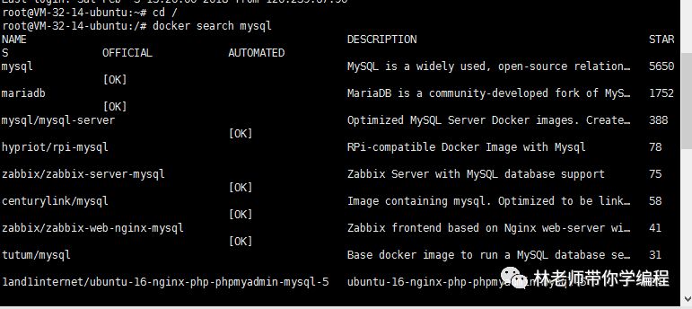 1.docker上面寻找mysq,命令如下所示:docker search mysql