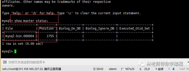 7.查看master数据库状态,命令如下:show master status;