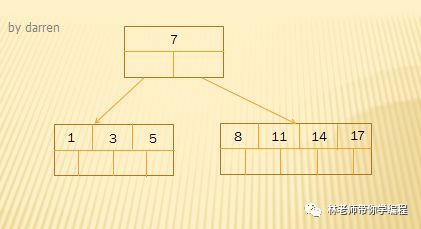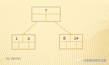 由于8是大于7的,故应该插入右子树,一个结点中最多存储4个关键字,按照插入规则,将中间关键字7上移形成父结点,其他按照50%分裂成两个结点,如上图。
