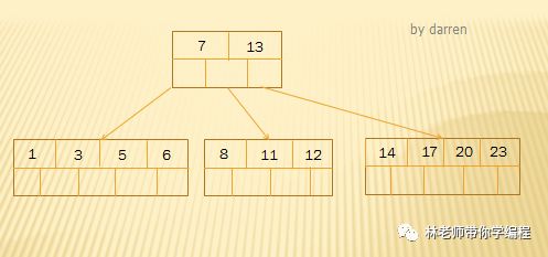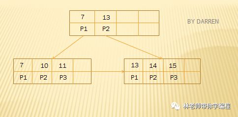 13大于7,应该插入右子树结点中,由于该结点中满4个关键字了,需要进行分裂。13刚好是中间关键字,上移到父结点中;其他按照50%分裂成两个结点。