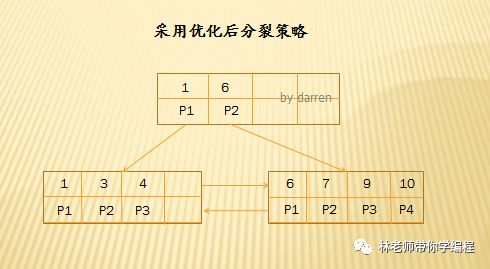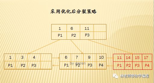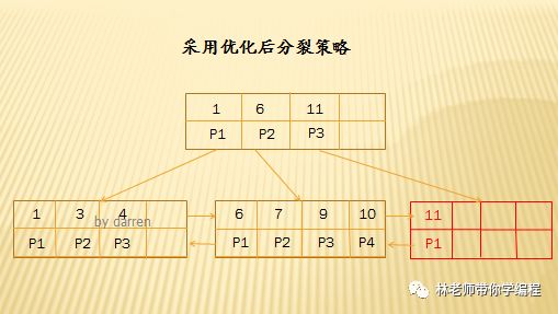 插入11时,由于最右结点空间已满,如果使用50%分裂策略,则需要分裂操作了,但是使用优化后的分裂策略,当该结点空间已满,还要判断该结点的父结点是否满了,如果父结点还有空间,那么插入到父结点中,所以11插入到父结点中了,同时形成一个子结点。