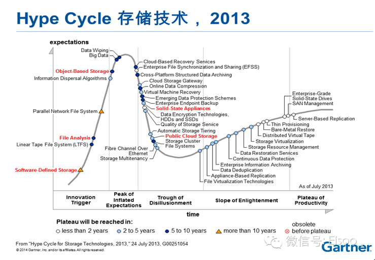 比如,软件定义存储技术(SDS),在2013年7月份刚刚推出,代表着未来存储发展的方向,技术将不再会被硬件来绑定,软件的地位将越来越凸显;大数据分析技术(file analysis),因为分析数据的同时,这些数据将会存储在存储池中,这项技术本身就推动着存储技术的发展;对象存储(object-based storage)技术还处于一个上升的阶段;全闪存阵列(Solid-State Appliances)技术处在逐渐下降的过程中,并不意味着这项技术会死掉,未来2-3年将会出现一个上升的势头,从而慢慢走向成熟;公有云存储(Pubic Cloud Storage)技术正在进入一个低谷,由于有一些云存储厂商的倒闭导致对云存储期望值下降非常厉害,但是从长远来看,它会很有前景,因为价格便宜,很多企业会基于成本的压力把自己的数据放到公有云上去,公有云存储的市场本身处在相对良性市场,所以虽然用户对它的信心相对处于低谷阶段,这项技术仍然会得到发展,亚马逊这样的公司也会添砖加瓦,以更低的公有云存储价格来吸引客户。