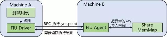 -fiu_agent:和测试的目标进程运行在相同机器上,负责接受fiu_driver的指令并在目标测试的机器上进行各种操作,完成这些操作一般通过编写shell脚本完成;FIU本身提供一些shell原型,用户开发的shell原型会自动同步到fiu_driver端,所以测试行为可以灵活扩展;fiu_agent和fiu_engine之间通过named shared memory同步fiu_driver开启的sync point;
