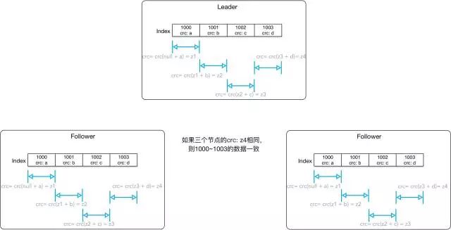 如图所示,三个节点均从某个index开始,计算连续的checksum,只要相同的index有相同的checksum,则认为三节点数据均一致。