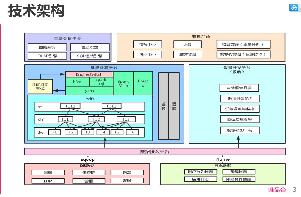 这个技术架构主要关注于离线数据平台。原始数据通过flume和sqoop接入不同的数据源,离线的ETL主要通过Hive 和SparkSQL进行数据处理。Presto主要用于Ad hoc的查询任务。这些工作都在数据开发平台自研的数坊中进行。ETL开发自助的数据查询、定时任务ETL开发以及自助报表订阅,这些作业通过调度程序和作业前置依赖进行调度。在前端我们开发了自助分析平台和各种数据产品,比如比价选品、魔方等数据应用于生产。
