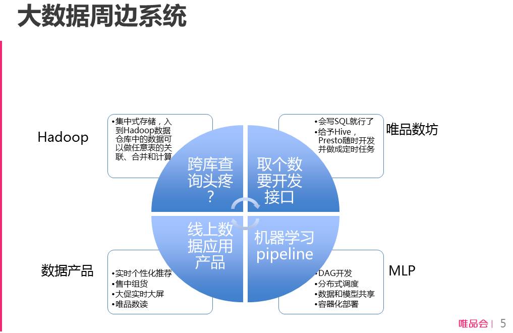 首先,通过专为海量数据批量处理设计的Hadoop集中式存储数据的平台,数据进入Hive数据仓库后,任意表就能关联、合并和计算,同时还保存了全量数据。SQL基本是个人人都会的开发语言,在唯品数坊中通过SQL查询和处理数据,结合调度系统,就可以自动处理,合理分配资源执行大数据量的数据批量任务。对于个性化推荐需求,机器学习pipeline建立了DAG,开发者通过DAG Editor就可以通过拖拉的方式建立机器学习实例,并且分布式进行调度。大数据除了应用于内部数据分析工具外,还出品线上业务的数据产品比如消费者在前端看到的实时个性化推荐,内部比价系统和供应商用于生产的售中组货,魔方等。