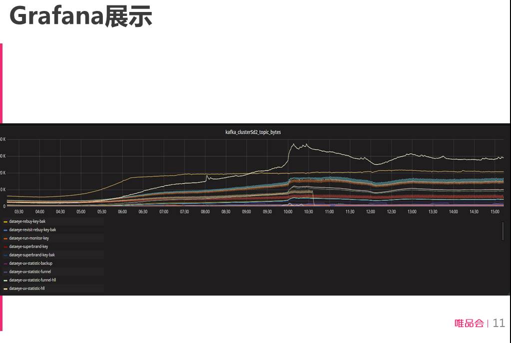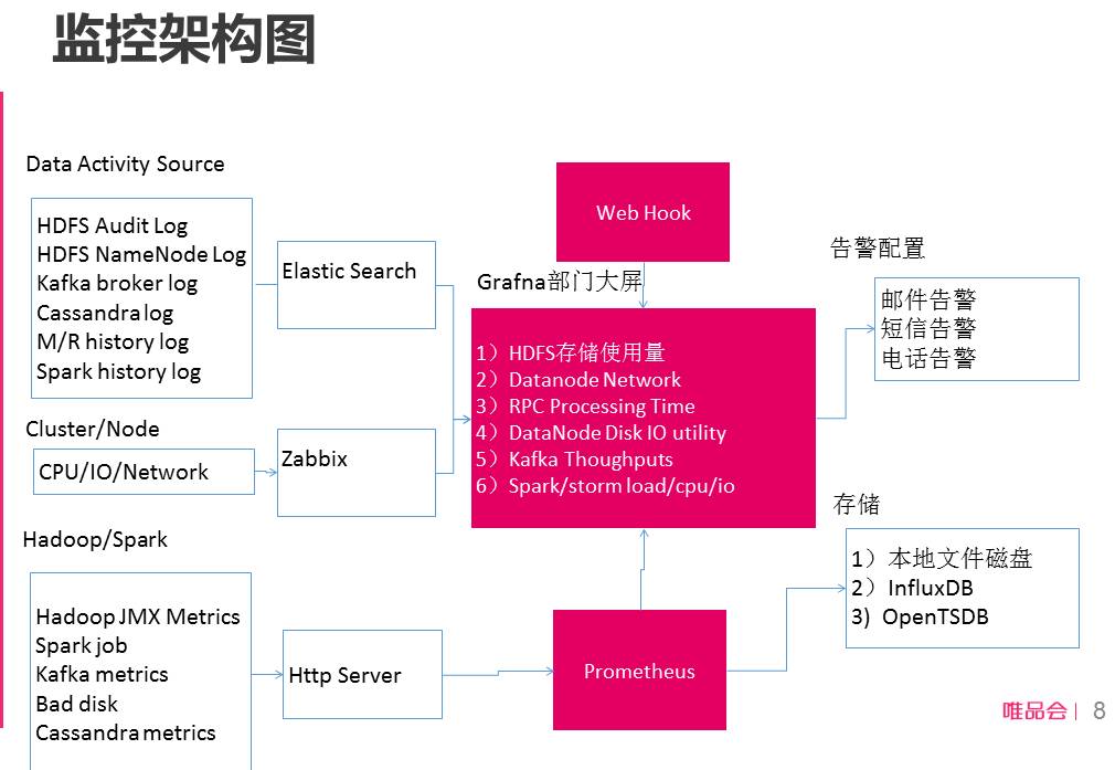 用ES来监控日志文件和Zabbix来做机器层面的监控是我们做了比较久的,今年我们新的尝试是引入Prometheus和Grafna来重构服务层的监控。Prometheus相当于就是开源版本的Borgmon,而Borgmon是Google内部做大规模集群的监控系统。唯品会使用Prometheus主动Pull各种指标数据通过Grafana完美展现部门大屏dashboard。目前Grafana已经对接原有的Zabbix数据源和ES数据源,同时开通了基于jmx的各种开源组件监控,包括Kafka,Hadoop,Cassandra等,对接邮件、短信和电话告警用于生产。