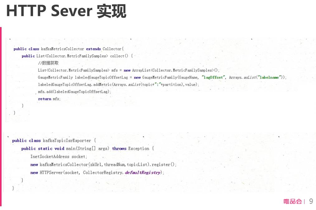 这里简单介绍一下如何通过Prometheus做服务层面的监控原理。Preometheus 是采用pull的模式而不是通过玩agent的方式拿数据,这样的好处就是不用客户端的强依赖。但是prometheus对于数据格式是有要求的,所以在这里首先需要建立一个Http Server来将metrics转换成prometheus认识的文本格式。这里的例子是获取kafka lagoffset,然后这个服务开放以后,prometheus就可以主动pull这个网址来实时抓到数据了。