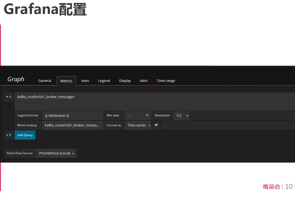 Prometheus拿到数据后就会存储到本地或者remote的存储,前端Grafana的配置也是非常简单的,定义好数据源和metrics,加到Graph就可以了。在这个配置中,可以通过嵌入的web hook来定义告警规则。规则定义也是所见即所得,运维人员非常容易上手。