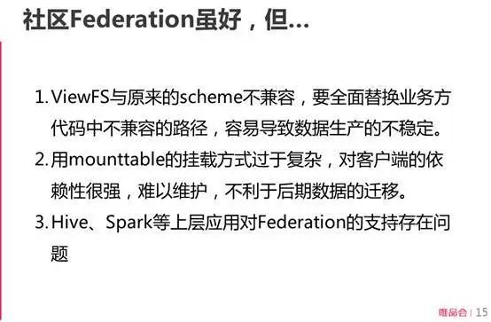 目前业界比较普遍的做法是采用Federation,我们在调研后发现federation需要业务分割的比较清楚,这和我们目前的业务模式不是非常吻合,而且它需要通过比较重的客户端ViewFS来实现,需要使用mounttable的挂载方式,这就好比为行驶中的汽车换轮胎一样。有没有一种更加轻量级的方法来实现类似的横向扩展呢?
