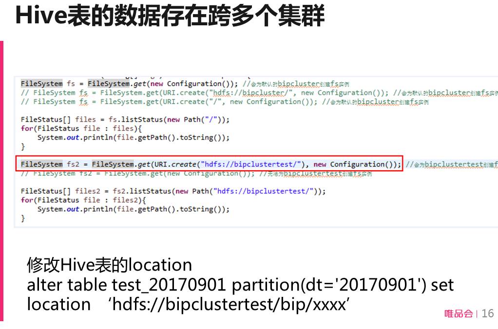 多HDFS扩展首先需要解决的问题是如何透明地支持上层应用。我们用的方法是使用Hive的location特性使得表的location是可以区分集群的。这个可以支持一个表的不同分区在不同HDFS集群上面。