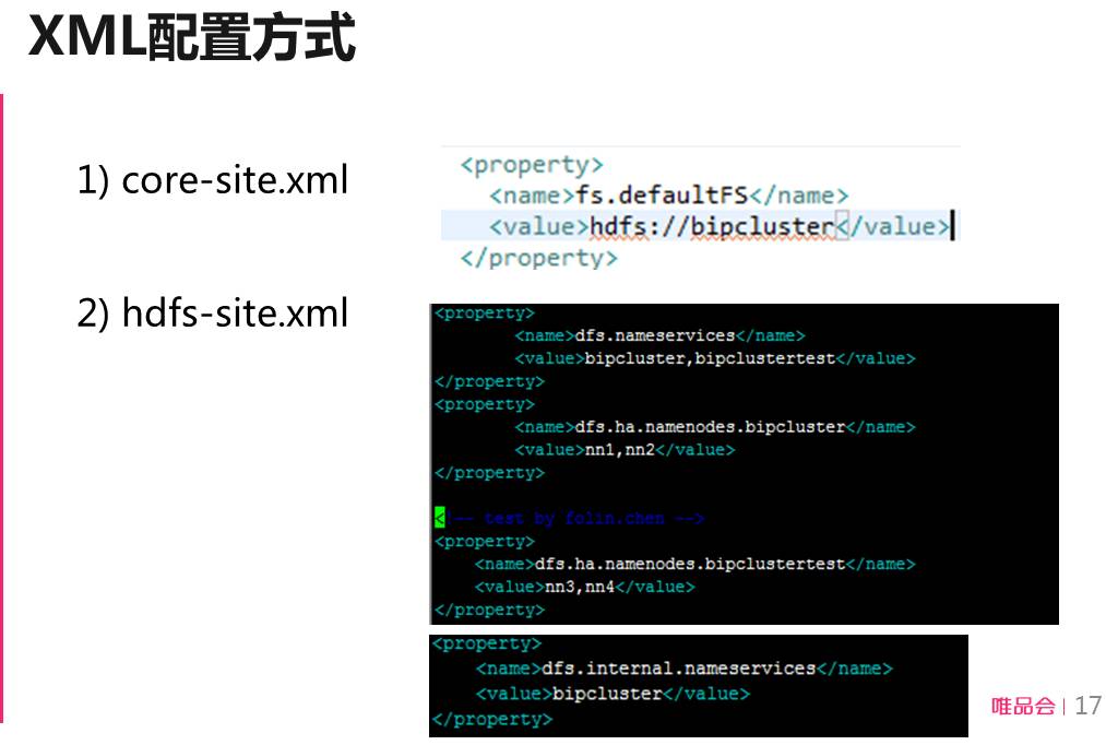 在xml配置上,和federation 非常类似,但是去除了部分关于mount table的配置和减少重客户端viewFS的方式。我们增加了internal.dataservices的属性,来指定缺省的集群。