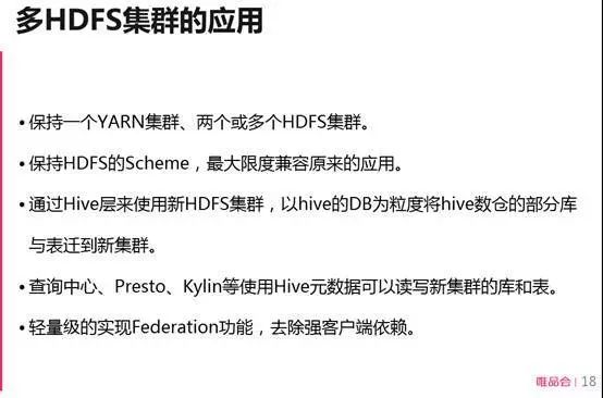说完了监控部分,我们开始今年的一个落地尝试--实现多HDFS集群。在调研落地时我们发现目前比较流行的社区Federation方案与业务不是非常兼容。在这个基础上,我们研究了多HDFS集群的应用,保持一个YARN、支持多个HDFS集群方式。该实践的特点是通过Hive层来使HDFS透明化,最大限度兼容原来的应用。