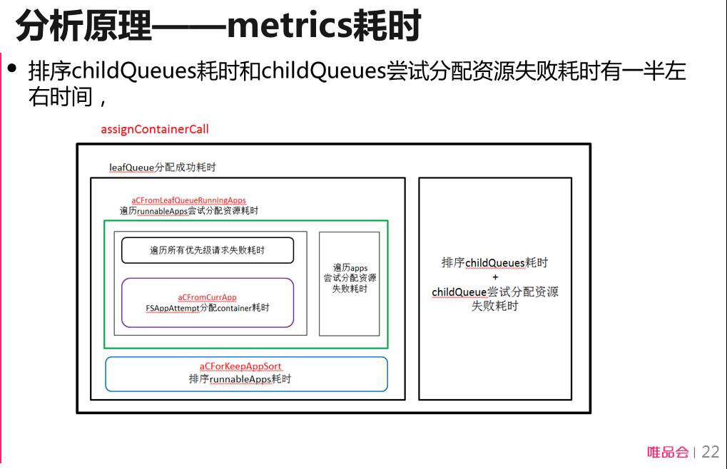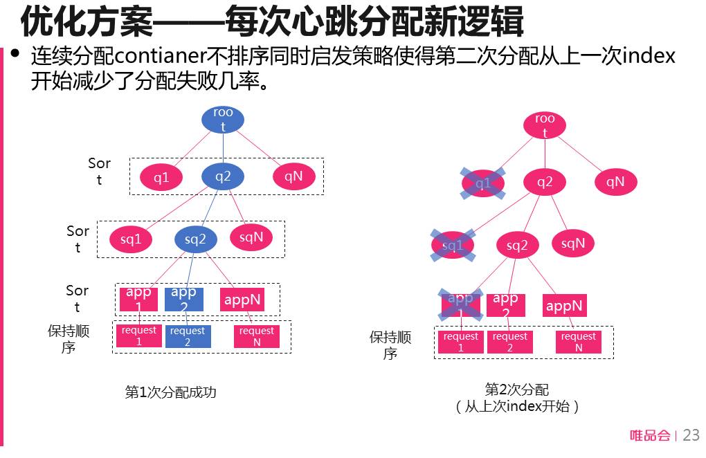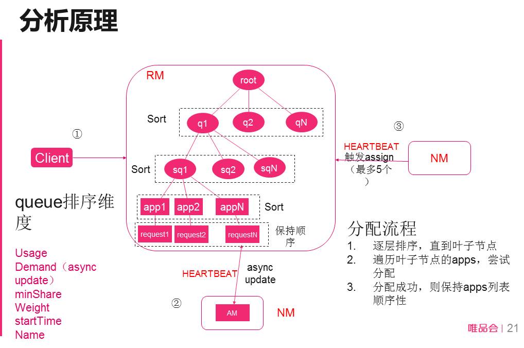 优化首先要了解分配原理是怎样的。唯品会使用的yarn的分配策略是fair scheduler,它的特点是倾向于公平分配。调度器每次选择作业资源缺额最大的。那么每一次分配逐层遍历并根据缺额进行倒排序,然后尝试分配。