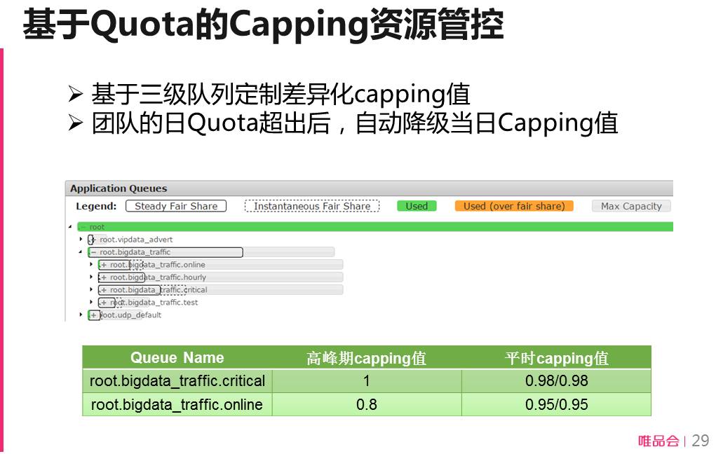 另外一点是我们已经实现了为各业务团队配置资源的限额(Quota),一旦该团队当日使用量超过日Quota值,系统将会自动降级该团队下面队列的Capping阈值。