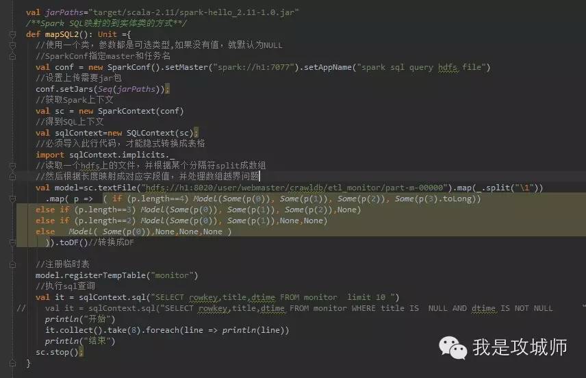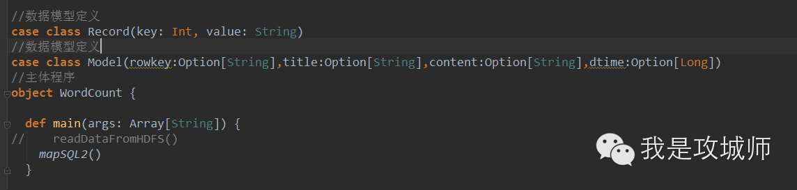 映射实体类的方式读取HDFS方式和字段,注意在Scala的Objcet最上面有个case 类定义,一定要放在