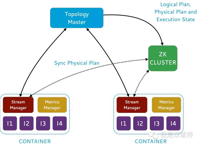 对于Heron的整体架构请看图1和图2。用户使用Storm API来构建和提交topologies来实现一个调度。调度运行的每一个topology作为一个job,有几个容器组成,其中一个容器运行主topology,负责管理topology。每个剩余的容器运行一个流管理器,负责数据路由——一个权值管理器,用来搜集和报告各种权值和多个Heron实例(运行user-defined spout/bolt代码)进程。这些容器是基于集群中的节点的资源可用性来实现分配和调度。对于topology元数据,例如物理计划和执行细节,都是保管在Zookeeper中。