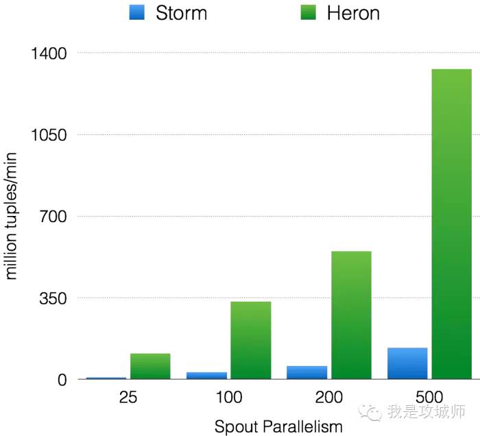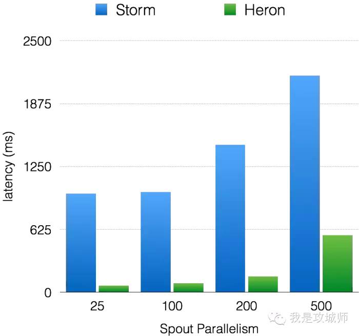 如图4所示,Heron和Storm的吞吐量呈现线性增长的趋势。然而,在所有的实验中,Heron吞吐量比Storm高10–14倍。同样在端至端延迟方面,如图5所示,两者都在增加,可Heron延迟比Storm低5–15倍。
