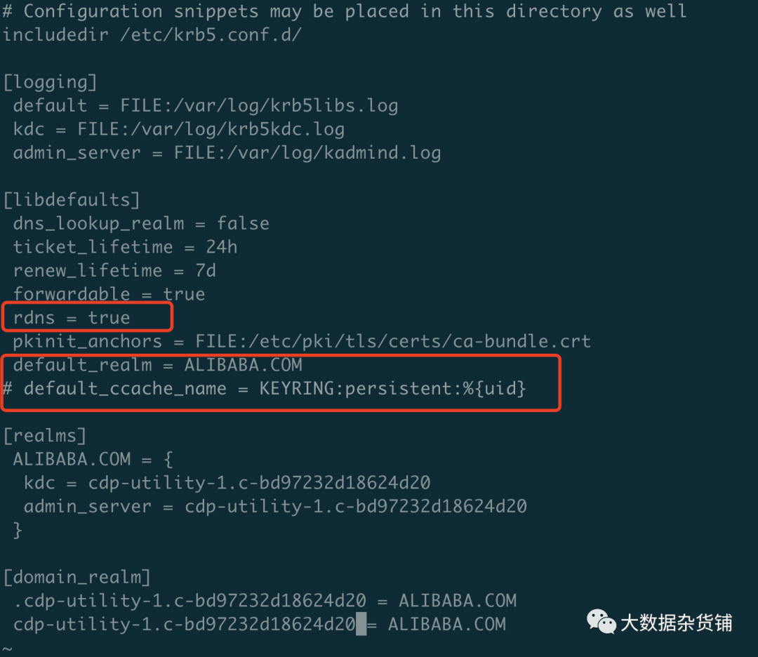 [root@cdp-utility-1 ~]# vim etc/krb5.conf# Configuration snippets may be placed in this directory as wellincludedir etc/krb5.conf.d/[logging]default = FILE:/var/log/krb5libs.logkdc = FILE:/var/log/krb5kdc.logadmin_server = FILE:/var/log/kadmind.log[libdefaults]dns_lookup_realm = falseticket_lifetime = 24hrenew_lifetime = 7dforwardable = truerdns = true##特别注意,默认是falsepkinit_anchors = FILE:/etc/pki/tls/certs/ca-bundle.crtdefault_realm = ALIBABA.COM# default_ccache_name = KEYRING:persistent:%{uid}##特别注意,需要注释掉[realms]ALIBABA.COM = {kdc = cdp-utility-1.c-bd97232d18624d20admin_server = cdp-utility-1.c-bd97232d18624d20}[domain_realm]. cdp-utility-1.c-bd97232d18624d20 = ALIBABA.COMcdp-utility-1.c-bd97232d18624d20 = ALIBABA.COM