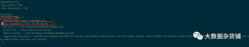[root@cdp-utility-1 ~]# vim var/kerberos/krb5kdc/kdc.conf[kdcdefaults]kdc_ports = 88kdc_tcp_ports = 88[realms]ALIBABA.COM= {#master_key_type = aes256-ctsmax_renewable_life= 7d 0h 0m 0sacl_file = var/kerberos/krb5kdc/kadm5.acldict_file = usr/share/dict/wordsadmin_keytab = var/kerberos/krb5kdc/kadm5.keytabsupported_enctypes = aes256-cts:normal aes128-cts:normal des3-hmac-sha1:normal arcfour-hmac:normal des-hmac-sha1:normal des-cbc-md5:normal des-cbc-crc:normal}