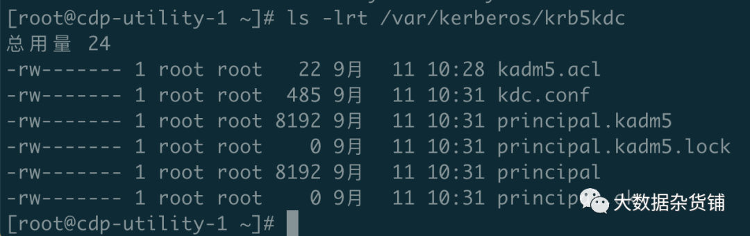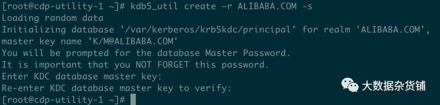 [root@cdp-utility-1 ~]# kdb5_util create –r ALIBABA.COM -sLoading random dataInitializing database '/var/kerberos/krb5kdc/principal' for realm 'ALIBABA.COM',master key name 'K/M@ALIBABA.COM'You will be prompted for the database Master Password.It is important that you NOT FORGET this password.Enter KDC database master key:Re-enter KDC database master key to verify:[root@cdp-utility-1 ~]#