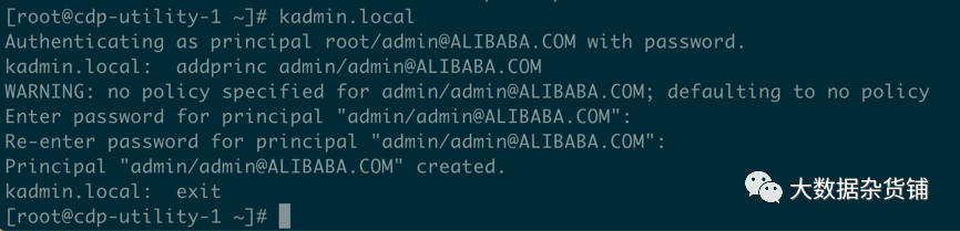 [root@cdp-utility-1 ~]# kadmin.localAuthenticating as principal root/admin@ALIBABA.COM with password.kadmin.local: addprinc admin/admin@ALIBABA.COMWARNING: no policy specified for admin/admin@ALIBABA.COM; defaulting to no policyEnter password for principal "admin/admin@ALIBABA.COM":Re-enter password for principal "admin/admin@ALIBABA.COM":Principal "admin/admin@ALIBABA.COM" created.kadmin.local: exit[root@cdp-utility-1 ~]#