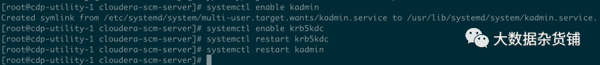 [root@cdp-utility-1 cloudera-scm-server]# systemctl enable kadminCreated symlink from etc/systemd/system/multi-user.target.wants/kadmin.service to usr/lib/systemd/system/kadmin.service.[root@cdp-utility-1 cloudera-scm-server]# systemctl enable krb5kdc[root@cdp-utility-1 cloudera-scm-server]# systemctl restart krb5kdc[root@cdp-utility-1 cloudera-scm-server]# systemctl restart kadmin[root@cdp-utility-1 cloudera-scm-server]#